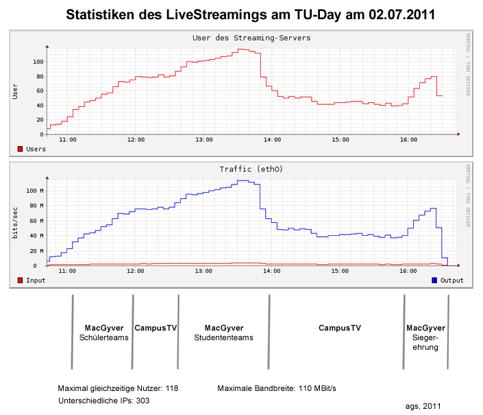 Auf dem TU-Day 2011 veranstalteten wir (ags) ein umfangreiches Rahmenprogramm rund um den im Audimax stattfindenden Ideenwettbewerb MacGyver. Das Sendungsformat CampusTV bot interessante, abwechslungsreiche Berichterstattung für Studierende. Das gesamte Programm war sowohl auf der Audimax-Leinwand als auch hier auf der Seite live zu sehen.
